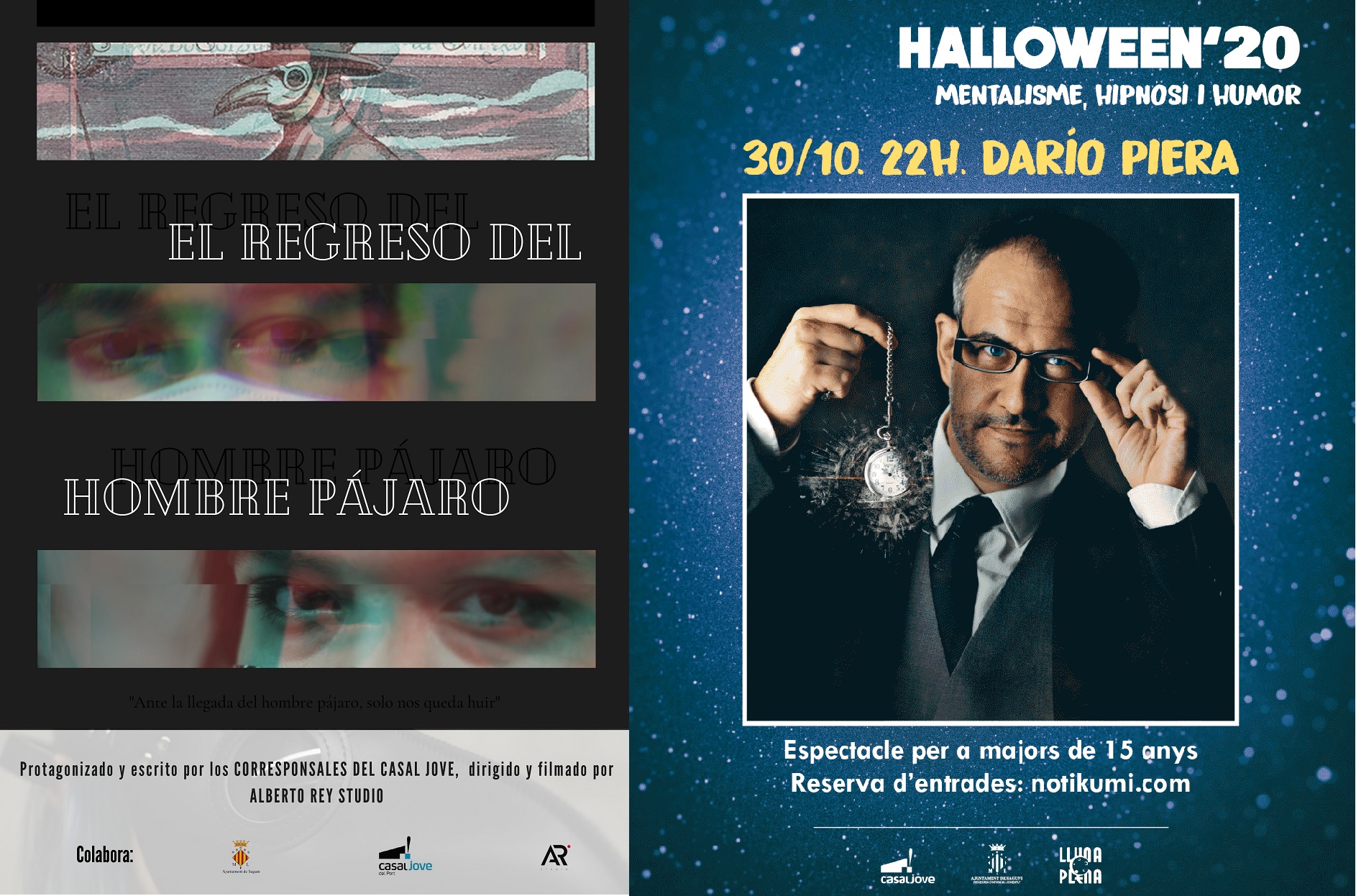 El divendres 23 d'octubre, a les 21.30 hores, tindrà lloc la presentació del curtmetratge El regreso del hombre pájaro, guió i protagonitzat per un grup de Corresponsals, dirigit per Alberto Rey Studio i produït per la Regidoria de Joventut. Esta idea sorgix d'un grup de corresponsals davant la impossibilitat de realitzar el tradicional Túnel del terror. Els protagonistes comptaran el treball realitzat i l'experiència en el Casal Jove.