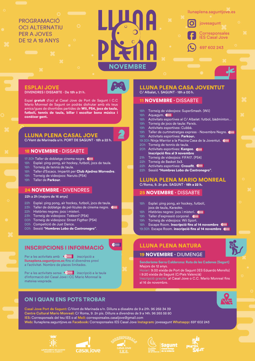 La regidoria de Joventut de l'Ajuntament de Sagunt ha presentat l'oferta d'oci alternatiu per al mes de novembre. El programa Lluna Plena, que ve desenvolupant-se en els últims anys, ha ampliat de manera estable l'oferta al nucli de Sagunt.
