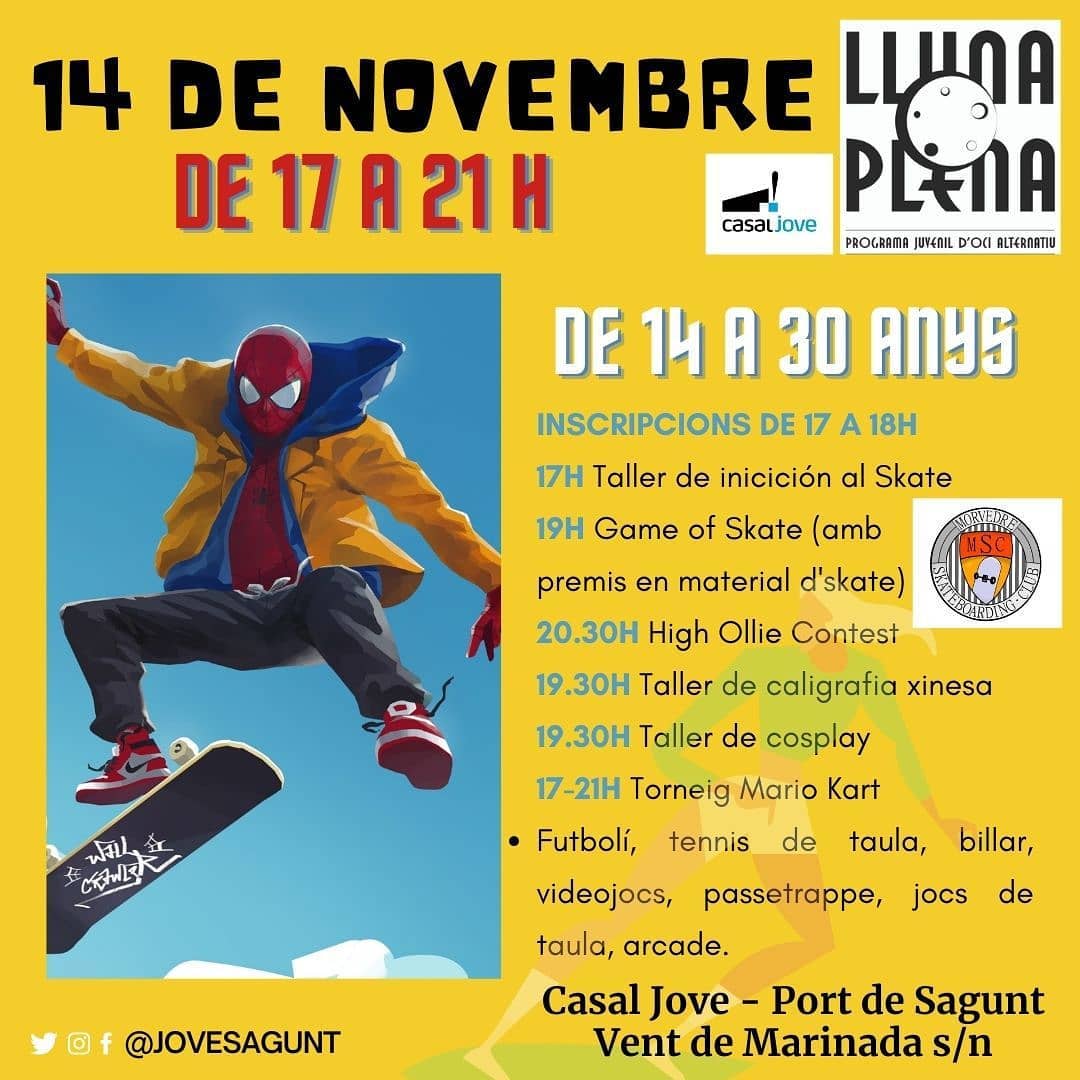 La regidoria de Joventut i Infància de l'Ajuntament de Sagunt, juntament amb l'equip de corresponsals IES del Casal Jove, ha organitzat per a dissabte que ve, 14 de novembre de 17 a 21 hores, este programa d'activitats d'oci alternatiu per als i les jóvensde 14 a 30 anys en el Casal Jove del Port de Sagunt.