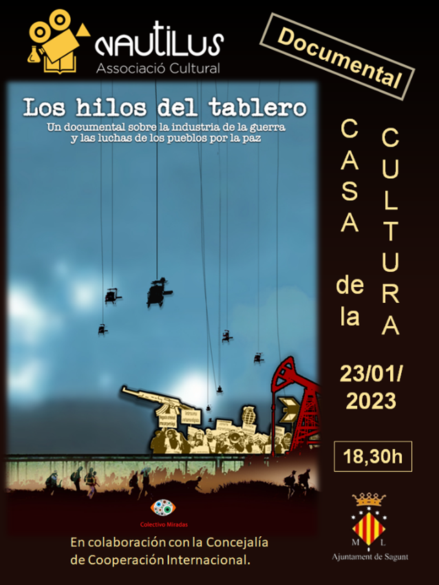 Hui dilluns, 23 de gener, l’Associació Cultural Nautilus presenta un acte sobre la indústria de la guerra i les lluites dels pobles per la pau, en col·laboració amb la regidoria de Cooperació Internacional de l'Ajuntament de Sagunt, amb la projecció del documental Los hilos del tablero del director José Gayá. Este acte forma part de la programació de la regidoria de Cultura.
