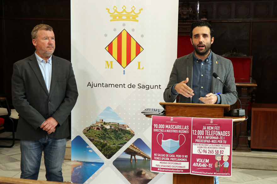 L'Ajuntament de Sagunt ha adquirit 90 0000 màscares que distribuirà entre la població a partir del pròxim dimarts, 21 d'abril, per correu. Estes màscares tenen un 90% de filtrat, és a dir que tenen un alt nivell de protecció per a evitar que qualsevol tipus de tos o de germen que puga eixir de la boca puga passar per eixa màscara. Així ho ha anunciat l'alcalde de Sagunt, Darío Moreno, en la roda de premsa celebrada hui en el consistori i que ha sigut retransmesa en directe a través del canal de Youtube del Gabinet de Comunicació de l'Ajuntament de Sagunt.