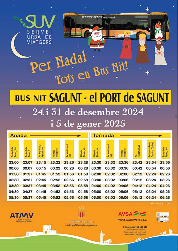 L'Ajuntament de Sagunt, des de la regidoria de Mobilitat Urbana, posa en marxa un any més la campanya ‘Per Nadal, Tots en Bus Nit!’, que amplia el servici d'autobús nocturn durant estes festes de Nadal. Al servici habitual dels dissabtes, se li unirà el de les nits dels dimarts 24 i 31 de desembre, és a dir, nit de Nadal i nit de Cap d'Any, així com el del diumenge 5 de gener, en la nit prèvia al Dia de Reis.