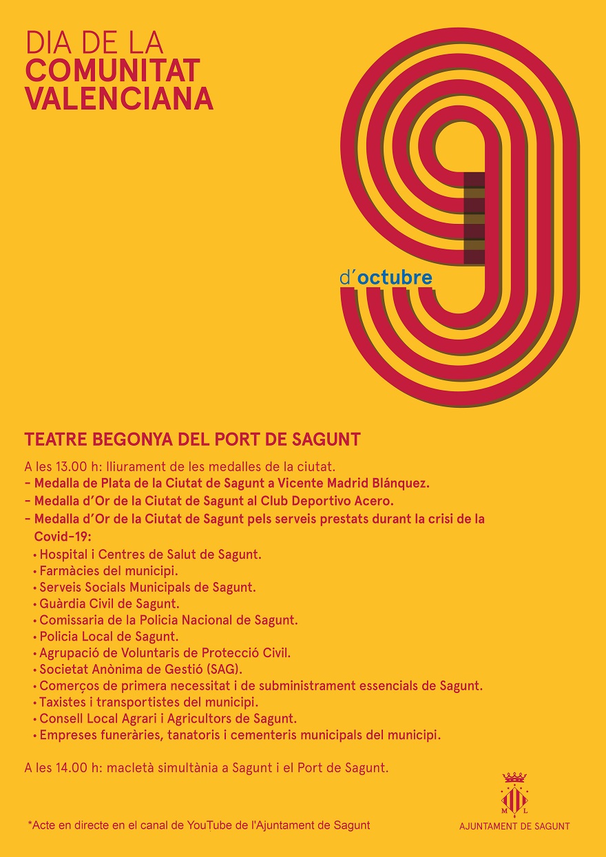 L'Ajuntament de Sagunt celebrarà el Dia de la Comunitat Valenciana amb un acte institucional de lliurament de Medalles de Plata i d'Or de la Ciutat. El Teatre de Begoña del Port de Sagunt acollirà el divendres 9 d'octubre, a les 13 h, l'acte d'homenatge a persones, clubs i institucions públiques i privades per la seua labor o servicis prestats, el qual serà emés en directe. Una vegada finalitzat, a les 14 h es dispararan dues mascletaes simultànies a Sagunt i al Port de Sagunt.