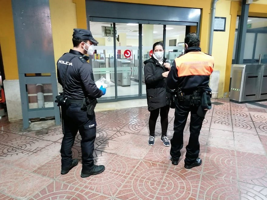 Policia Nacional i Protecció Civil lliurant mascaretes en l'estació de tren de Sagunt