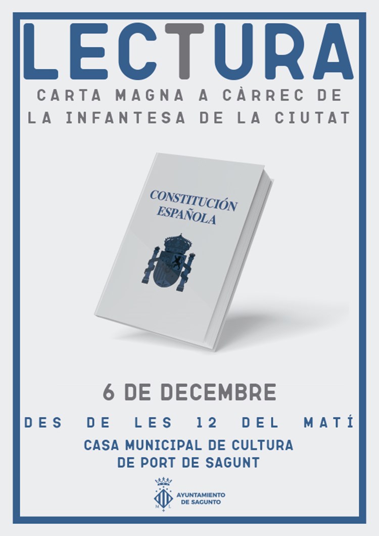 L'Ajuntament de Sagunt convida la ciutadania a participar el Dia de la Constitució en una lectura pública de la Carta Magna a càrrec de la infància del municipi. Dilluns que ve 6 de desembre, a les 12.00 hores, la Casa Municipal de Cultura del Port de Sagunt acollirà este acte.