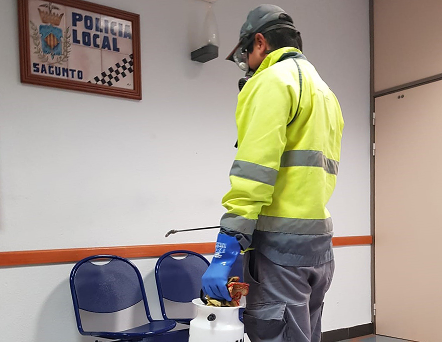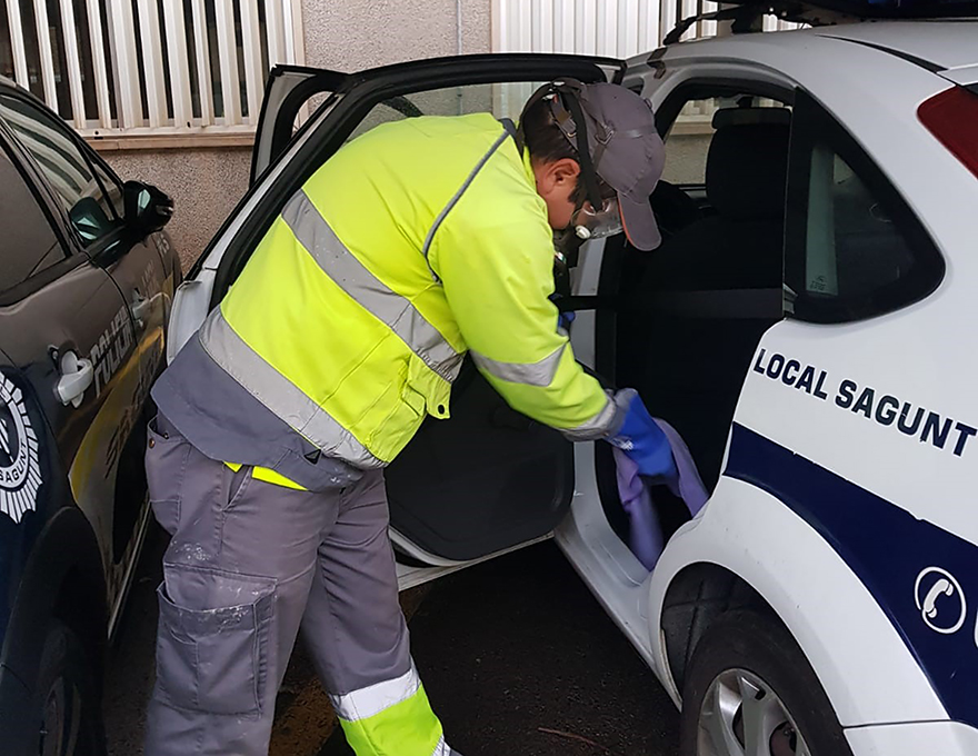 El departament de Sanitat i Consum de l'Ajuntament de Sagunt, a través de l'empresa encarregada del control de plagues, està desinfectant espais municipals que hui dia tenen una gran concurrència de personal, com per exemple la central de la Policia Local o, per les seues especials característiques en l'acompliment de les seues funcions, els cotxes policials.