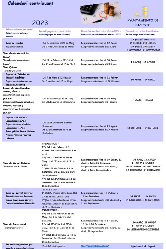Des del departament de Tresoreria de l'Ajuntament de Sagunt s'ha donat a conéixer recentment el calendari del contribuent del pròxim any 2023 perquè tota la ciutadania puga conéixer les dates de liquidació dels tributs municipals. L'anunci del calendari es pot consultar en el tauler d'anuncis de la Seu Electrònica de l'Ajuntament: https://sagunt.sedipualba.es/tablondeanuncios/anuncio.aspx?id=38453.