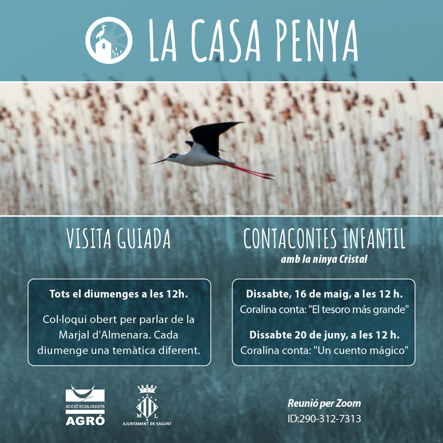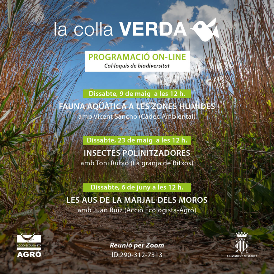 També informen sobre les activitats de la Colla Verda i de la Casa Penya els dissabtes a les 12 hores. La primera serà el 9 de maig, quan la Colla Verda convida a un col·loqui virtual amb el biòleg Vicent Sancho (Taller de Gestió Ambiental) sobre la fauna aquàtica de les nostres zones humides. El 23 de maig el col·loqui serà amb l'ambientòleg Toni Rubio (La Granja de Bitxos), que ens parlarà dels insectes pol·linitzadors. I el 6 de juny amb Juan Ruiz, educador de AE-Agró, que ens descobrirà els ocells de la Marjal dels Moros.
