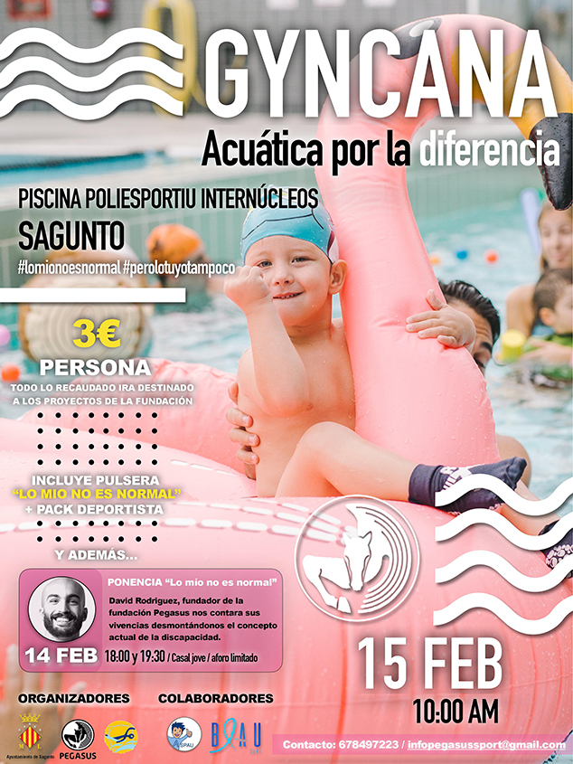 L'Ajuntament de Sagunt i la Fundació Pegasus amb la col·laboració de l'Associació Blau Surf organitzen el dia 15 de febrer l'esdeveniment inclusiu i solidari ‘Gyncana Aquàtica – Allò meu no és normal’. Este esdeveniment s'engloba dins de les activacions d’‘Allò meu no és normal, però allò teu tampoc’, programa de la Fundació Pegasus que té un objectiu inclusiu amb la finalitat de normalitzar la diferència a través de l'oci, l'esport i la cultura.