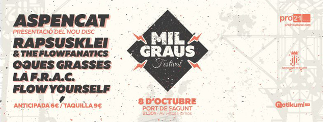 L'Ajuntament de Sagunt organitza “Mil Graus Festival”, un festival que se celebrarà, el pròxim 8 d'octubre, als peus del Forn Alt (Avinguda Alts Forns, Port de Sagunt). En el cartell del festival destaca l'actuació de Aspencat que presentarà el seu nou disc; i Rapsusklei, un dels artistes més reconeguts de l'escena del hip-hop estatal. Els acompanyaran Oques Grasses i la F.R.A.C, a més, tanca el cartell el grup local Flow Yourself.