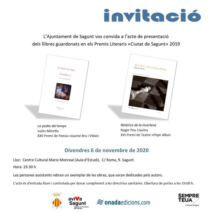 Isaïes Minetto, guanyador del XXII Premi de Poesia “Jaume Bru i Vidal”, per La pedra del temps, i Roger Pou, guanyador del XVI Premi de Teatre “Pepe Alba”, per Retòrica de la incertesa presentaran els seus llibres ja publicats per l'Ajuntament de Sagunt, a través de l’Agència de Promoció del Valencià (AVIVA Sagunt), i Onada Edicions, ja que a més del premi de 3 000 euros, se'ls premiava amb la publicació de les seues obres. En l’edició de 2019, el Premi de Novel·la va quedar desert.