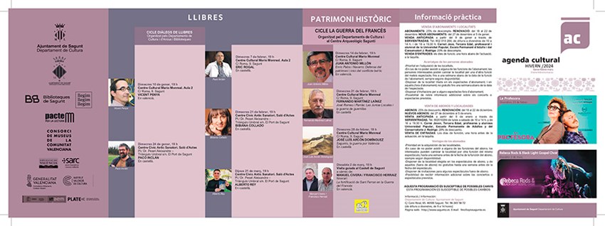 La regidoria de Cultura de l'Ajuntament de Sagunt ha presentat la programació cultural per al pròxim hivern. Els aficionats i les aficionades a la cultura podran gaudir d'una àmplia i variada programació en la qual hi haurà xarrades amb escriptors i escriptores, conferències sobre La Guerra del Francés, teatre, música i exposicions d'art. A la presentació han assistit l'alcalde de Sagunt, Darío Moreno; la regidora de Cultura, Ana María Quesada, així com artistes i representants d'entitats que participen en la programació: la pintora Carmen Esteve, el dramaturg Marcos Sproston, la presidenta de la Unió Musical Portenya, Asunción Edo, i un membre de la Junta Directiva de la Societat Musical Lira Saguntina, Francesc Caballer.