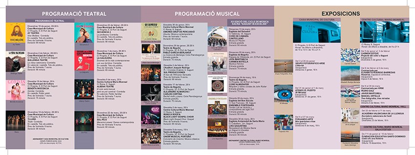 Quant a la programació teatral, Cultura ha programat la representació de huit obres, entre les quals destaca una de dansa contemporània, Macarron power de Sol Picó; La professora, de Seqüència 3; El món està trencat, però és pot caminar, de Albena Teatre, en la qual té un paper destacat l'actriu saguntina Carla Pascual. També podrem gaudir de Vive Molière d'Ai Teatre, La vídua valenciana de Bullanga Teatre, Grosses de Beneïda Innocència, Trash de Yllana i Escenes de la vida contemporània amb les seues bestioles de La Galguera