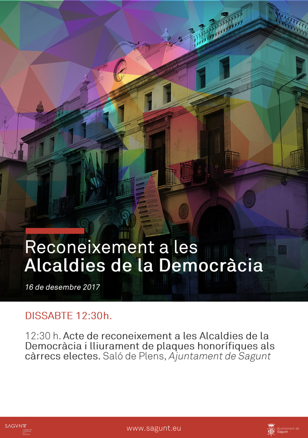 L'Ajuntament de Sagunt retrà un homenatge este dissabte als alcaldes i alcaldessa que el municipi ha tingut durant l'actual període democràtic, des de les eleccions municipals de 1979. Les persones homenatjades rebran una medalla en record de l'acte, que l'alcalde Quico Fernández considera “una bona ocasió per a ajuntar-nos i fer aquest reconeixement als qui han sigut representants dels ciutadans durant estos anys”.