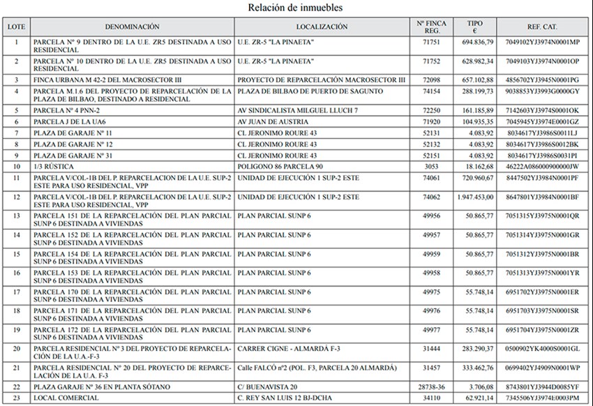 Es tracta principalment de parcel·les destinades a l'ús residencial o a vivendes protegides i per a lloguers socials, si bé també hi ha finques urbanes i rústiques, places de garatge i fins i tot un local comercial. Els preus d'eixida oscil·len des dels 4.000 euros aproximadament de les places de garatge fins als quasi dos milions d'euros en què s'ha taxat una parcel·la per a ús residencial situada en el SUP-2 Est.