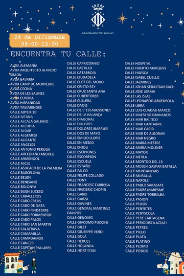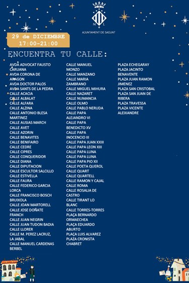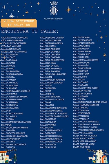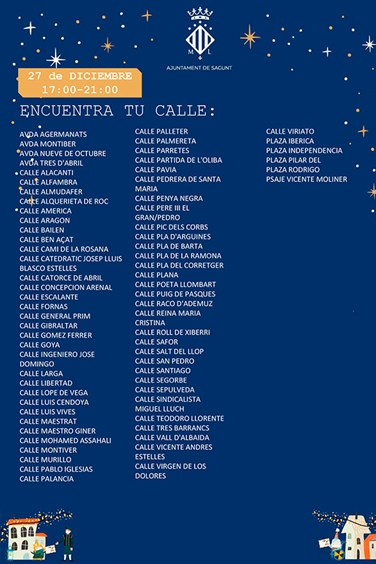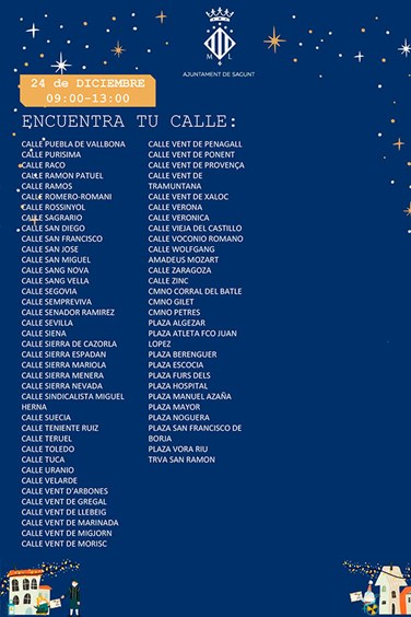 El divendres, dia 24, de 9 a 13 hores, passaran per Alcalá Galiano, Almardà, barri La Victoria, barri Las Sierras, barri Los Cabos, barri Los Metales, barri Los Músicos, barri Els Vents, barri Los Picos y Montañas, casc antic de Sagunt, Clot del Moro, Corinto, Crist Rei, plaça del Pi, plaça dels Furs i Santa Anna.