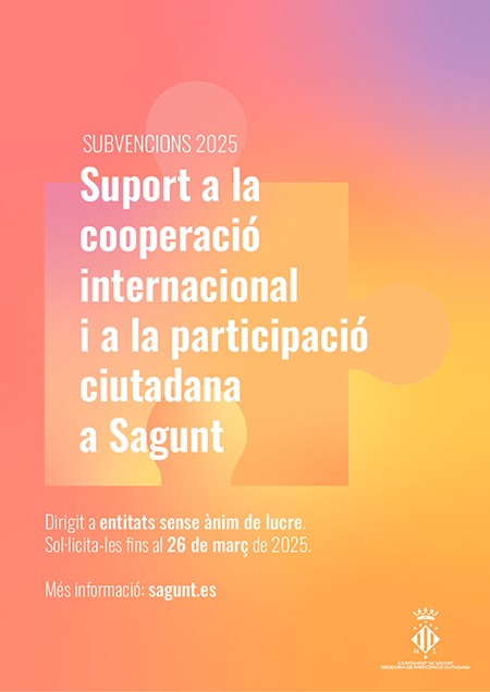 L'Ajuntament de Sagunt, a través de la Regidoria de Participació Ciutadana, ha obert el període de sol·licitud de dos noves convocatòries de subvencions per a l'any 2025. Estes ajudes estan dirigides a entitats sense ànim de lucre que treballen en pro de la participació ciutadana i la cooperació internacional, amb l'objectiu d'enfortir el teixit associatiu i donar suport a iniciatives que contribuïsquen al benestar comú tant en l’àmbit local com en el global.