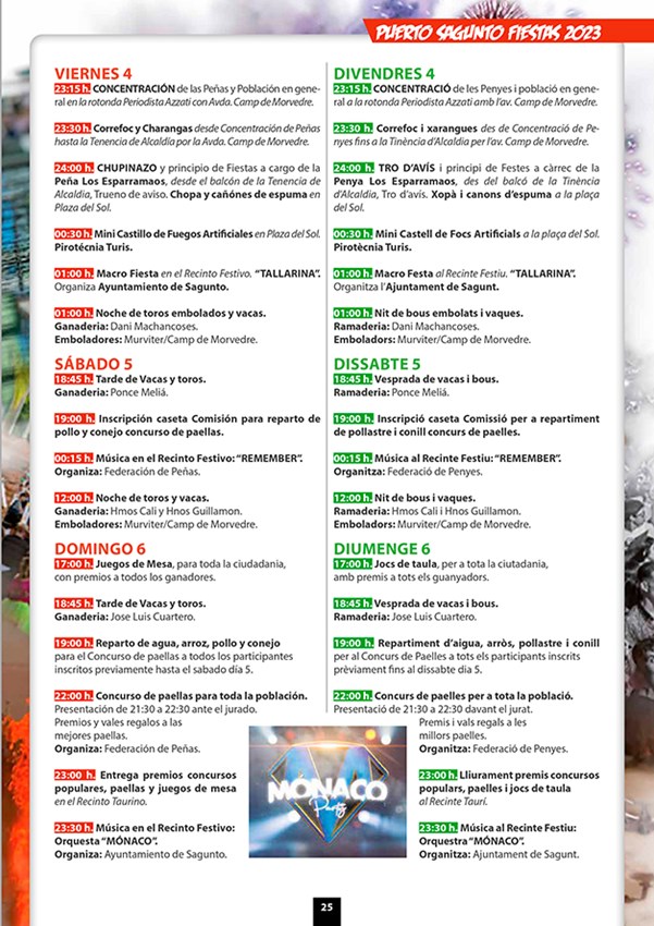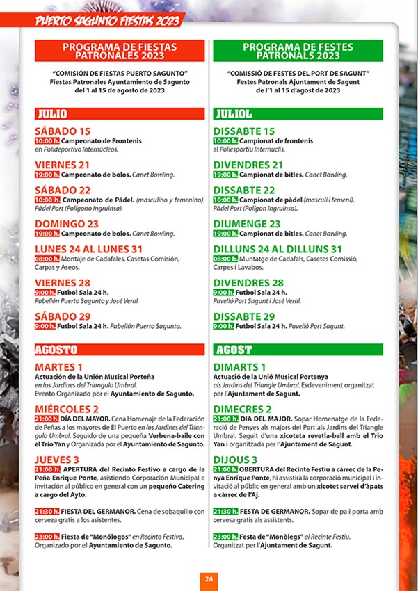 De la infinitat d'actes i activitats que tindran lloc durant les Festes Patronals del Port de Sagunt, cal esmentar el Dia del Major (2 d'agost), el Tro d’Avís i la Xopà (4 d'agost), la Cavalcada de l'Humor (9 d'agost), el Dia del Xiquet (10 d'agost), les Cucanyes Marítimes (15 d'agost); així com la setmana taurina (del 4 al 15 d'agost) amb encierrros de vaques i bous i la nit de vaques enfundades (9 d'agost). No obstant això, si vol conéixer amb major detall tota la programació d'enguany pot consultar el següent enllaç: Libro Fiestas 2023 Pto. Sagunto – Federación de Peñas del Puerto Sagunto (federacionpenyaspuerto.es)