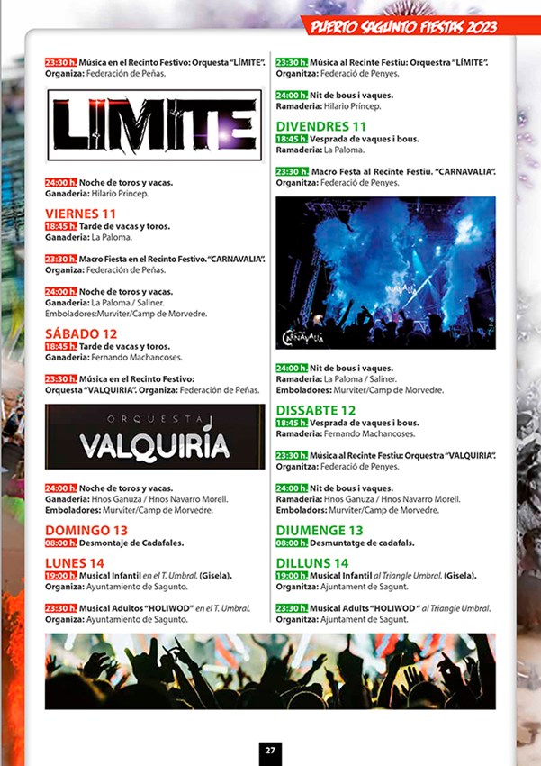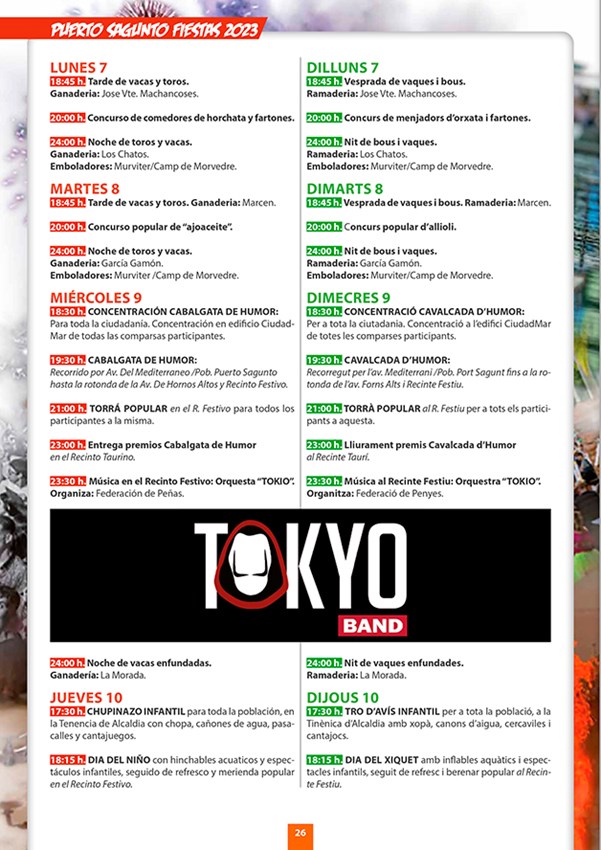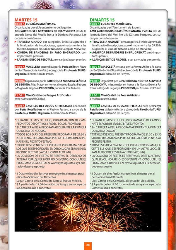 A més de les competicions esportives, que van disputant-se des del passat 15 de juliol, el programa de festes d'enguany està compost per concerts, musicals, actes taurins, concursos gastronòmics, correfocs, xarangues... que se celebraran fins al pròxim 15 d'agost.