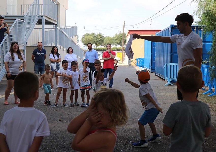 Els xiquets i les xiquetes que participen en la vint-i-dosena edició del Campus Delfín han rebut este matí en el Poliesportiu Municipal (internuclis) la visita de l'alcalde de Sagunt, Darío Moreno; i del regidor d'Activitat Física, Salut i Esports, Javier Timón. Este programa d'activitats esportives orientat a un públic infantil ha reunit un total de 840 participants, 422 en la primera etapa i 418 en la segona etapa.