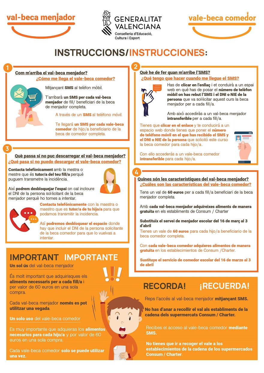 Amb això, s'accedix a un val intransferible per a cada fill/a a través del qual es poden adquirir aliments en Consum o Charter. El 'val-beca menjador' té un valor de 60 euros i substituix el servici de menjador escolar del 16 de març fins al 3 d'abril.Cada 'val-beca menjador' sol es pot utilitzar una vegada, per tant, és molt important que les famílies adquirisquen els aliments necessaris per a cada fill o filla i per valor de 60 euros en una sola compra.