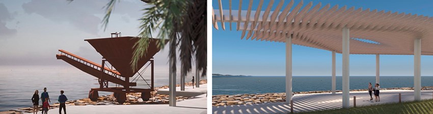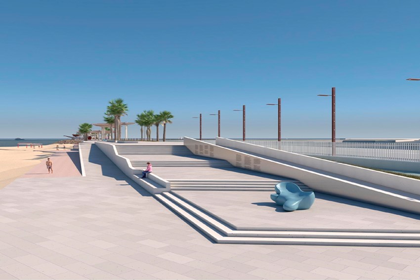 El projecte contempla solucions constructives amb diverses àrees com: Glorieta i entroncament amb el carrer Travessia del Mediterrani i Passeig Marítim; Escales d'accés i zona d'inici del passeig; Part central del passeig i espai d'activitats; Zona final del passeig i futur enllaç amb el pantalà; Zona d'interacció amb la platja; Zona del carril bici.