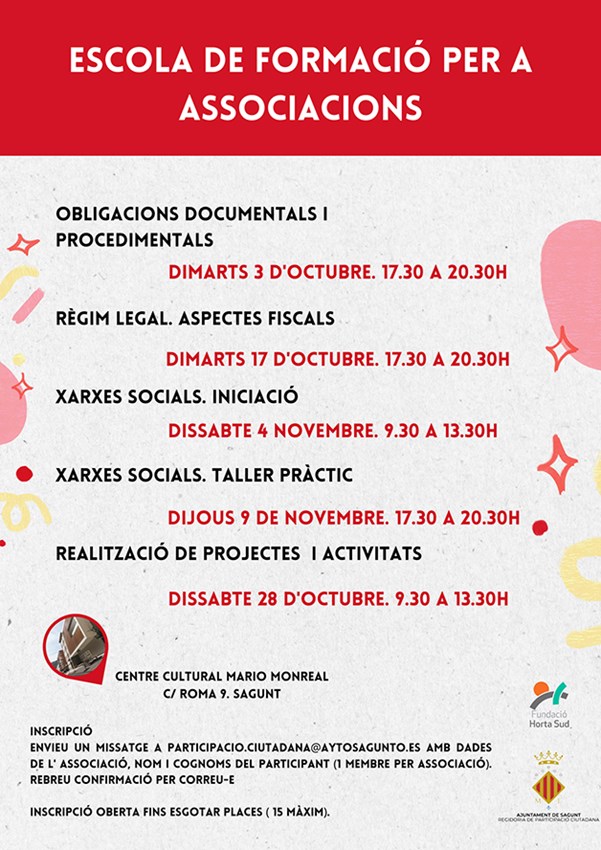 El pròxim mes d'octubre tindrà lloc a l'auditori Mario Monreal unes jornades per a totes les associacions del municipi. L'escola de formació per a associacions a Sagunt amb diferents i entretinguts tallers impartits de la mà de la Fundació Horta Sud.