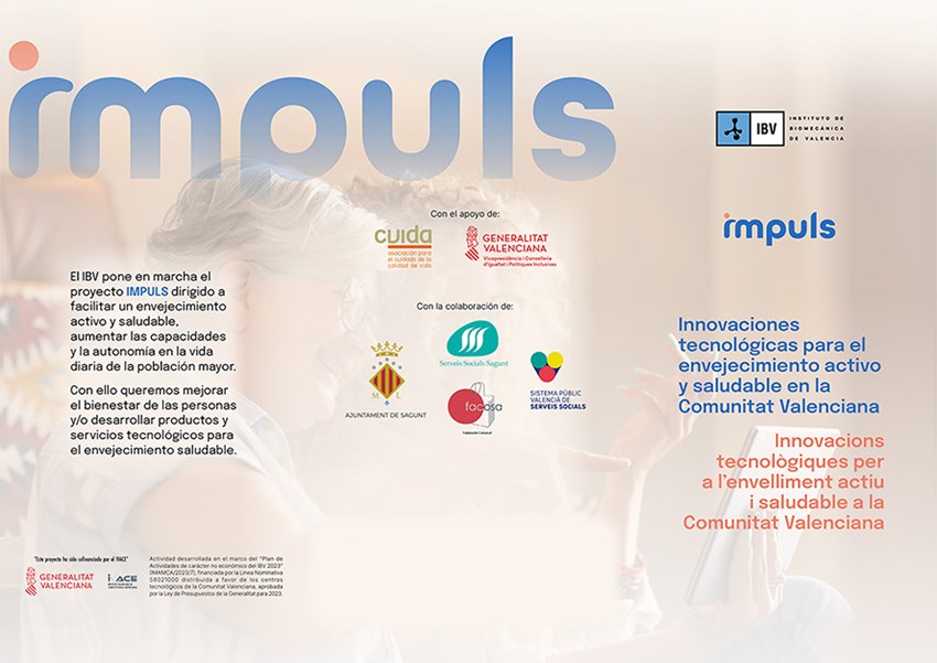IMPULS és un projecte d’I+D+i que està desenvolupant l'Institut de Biomecànica de València (IBV) en diverses localitats de la Comunitat Valenciana, entre les quals es troba el municipi de Sagunt. El departament de Serveis Socials de l'Ajuntament de Sagunt col·labora en esta investigació que busca impulsar innovacions tecnològiques per a l'envelliment actiu i saludable. IMPULS està cofinançat per l'Institut Valencià de Competitivitat Empresarial (IVACE) i secundat per la Conselleria d'Igualtat i Polítiques Inclusives de la Generalitat Valenciana, així com per l'Asociación para el Cuidado de la Calidad de Vida (CVIDA).
