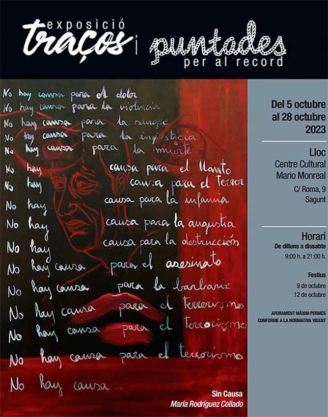 Trazos y puntadas para el recuerdo és una exposició de l'Asociación 11M Afectados del Terrorismo que podrà visitar-se al Centre Cultural Mario Monreal del 5 al 28 d'octubre, exceptuant el 9 i 12 d'octubre. La inauguració d'esta exposició, que forma part de la programació tardorenca de la Regidoria de Cultura, serà dijous 5 d'octubre a les 12 hores. I l'horari d'obertura de Trazos y puntadas para el recuerdo és de dilluns a dissabte des de les 9 a les 21 hores.
