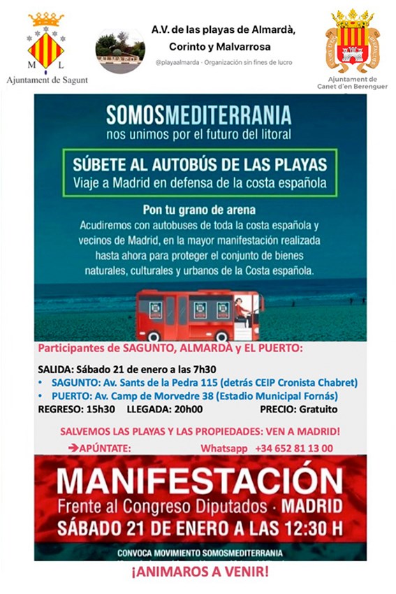 L'Associació de Veïns de les platges d’Almardà, Corinto i Malva-rosa ha organitzat, amb la col·laboració de l'Ajuntament de Sagunt i l'Ajuntament de Canet d'en Berenguer, un ‘autobús de les platges’ que viatjarà fins a Madrid per a la manifestació en defensa de la costa espanyola.