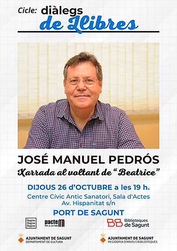 La següent jornada del cicle de literatura 'Diàlegs de Llibres' comptarà amb la participació de l'escriptor porteny José Manuel Pedrós. L'autor de novel·les com Beatrice i El códice de María Magdalena acudirà dijous que ve, 26 d'octubre, a les 19 hores al Centre Cívic Antic Sanatori per a repassar la seua trajectòria com a escriptor.