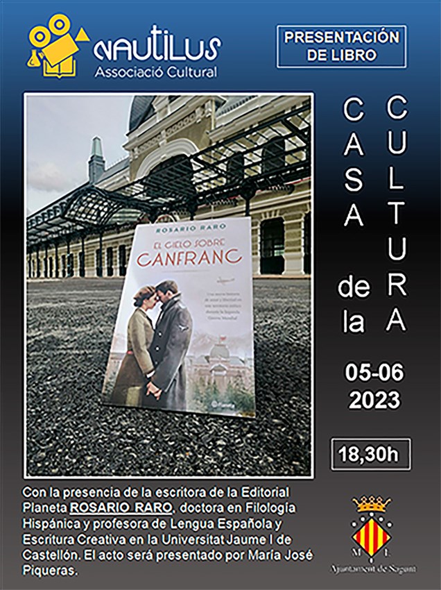 L'associació cultural Nautilus ha convidat Rosario Raro perquè presente l'últim llibre que ha publicat a través d'Editorial Planeta: El cielo sobre Canfranc. Este esdeveniment literari estarà conduït per María José Piqueras i tindrà lloc hui dilluns, 5 de juny, a les 18:30 hores a la Casa Municipal de Cultura del Port de Sagunt.