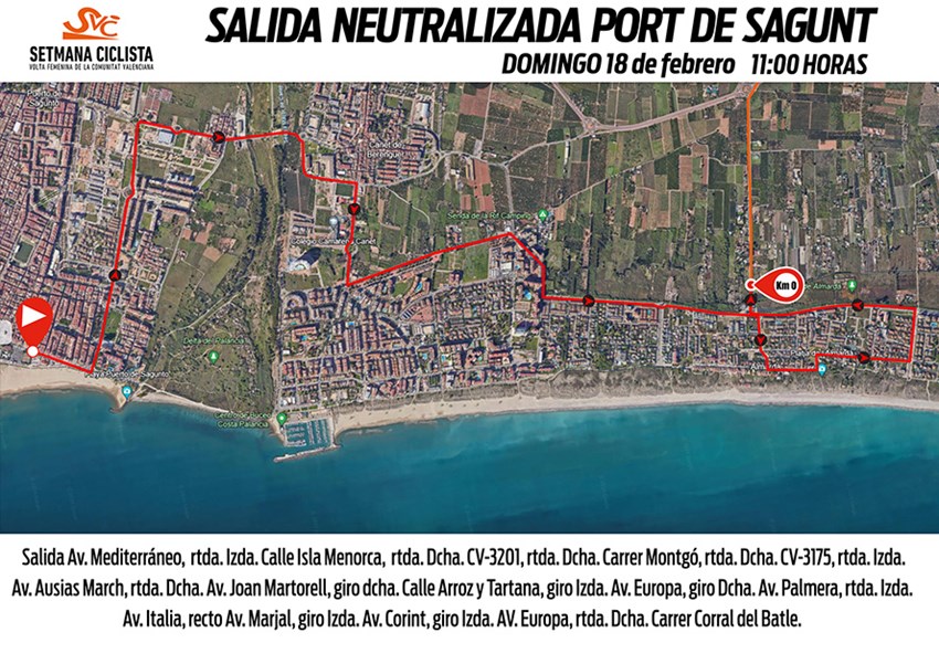 El recorregut de l'etapa al seu pas per Sagunt eixirà des de l'avinguda Mediterrani fins a la rotonda de l'àncora, per a incorporar-se al carrer Illa Menorca i a l'avinguda Arquitecte Alfredo Simón, fins a la rotonda del cementeri, on eixirà a la dreta en direcció a Canet d'en Berenguer per la CV-3201. Després de travessar Canet d'en Berenguer i eixir pel carrer Arròs i Tartana de la localitat veïna, la prova transcorrerà per l'avinguda Europa d’Almardà, girarà a la dreta en l'avinguda Palmera, seguint per l'avinguda Itàlia i a continuació per l'avinguda Marjal, on girarà a l'esquerra a l'avinguda Corinto per a tornar a incorporar-se a l'avinguda Europa. Des d'este punt girarà a la dreta al camí Corral del Batle per a eixir en direcció Almenara per la CV-320.