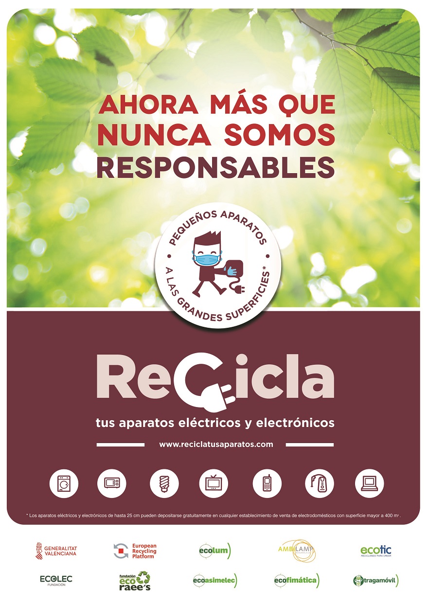 La campanya ‘Recicla els teus aparells’ arriba a la seua 4a edició i està impulsada per la Generalitat Valenciana, a través de la Conselleria d'Agricultura i Medi Ambient, en col·laboració amb les majors plataformes del sector, com ara Recyclia (Ecopilas, Ecofimática, Ecoasimelec i Tragamóvil), Ecolec, Ecotic, Ambilamp i Ecoraees.