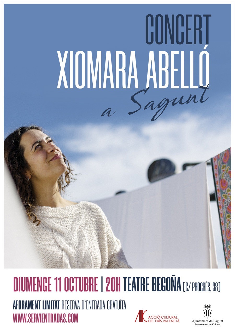 Diumenge que ve, 11 d'octubre, a les 20 hores el Teatre de Begonya del Port de Sagunt (C/Progrés, núm. 38) acollirà el concert de la cantautora castellonenca Xiomara Abelló on l'artista presentarà el seu treball Entre Teles. Este concert es troba emmarcat dins del programa d'actes del 9 d’Octubre de 2020 que han organitzat les regidories de Cultura i de Festes i Cultura Popular de l’Ajuntament de Sagunt.