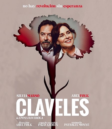 L'obra de teatre es representarà en castellà per a tots els públics i té una duració de 80 minuts. Claveles relata la trobada d'un home (Abel Folk) i una dona (Silvia Marsó) després de dècades sense veure's. Tots dos personatges compartixen un passat de compromís polític i amistat profunda que es va veure truncat per la traïció. Des d’aleshores, sumen silencis, mentides, rancors i el record d'un moment d'esperança immaculada: la Revolució dels Clavells.