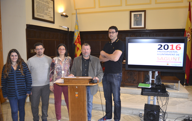 El alcalde y concejales del Equipo de Gobierno (C.Compromís, EU y ADN Morvedre) en la rueda  de prensa de presentación de la propuesta de presupuesto (17-12-2015)