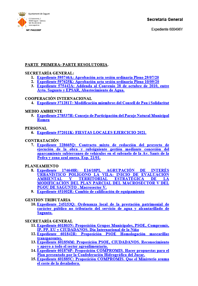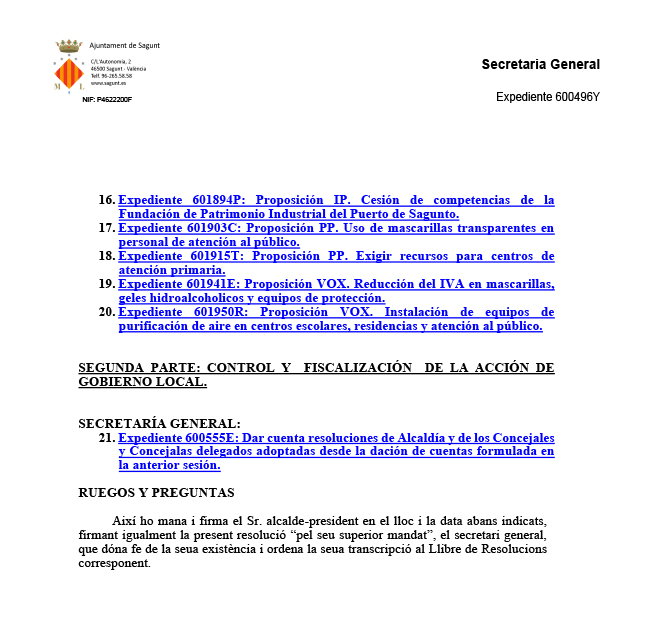 L'Ajuntament de Sagunt celebrarà dijous que ve, 29 d'octubre, el Ple Ordinari de la Corporació Municipal. Una vegada més, de manera telemàtica per complir amb les recomanacions de seguretat sanitàries a causa de la situació actual provocada per la pandèmia del coronavirus.