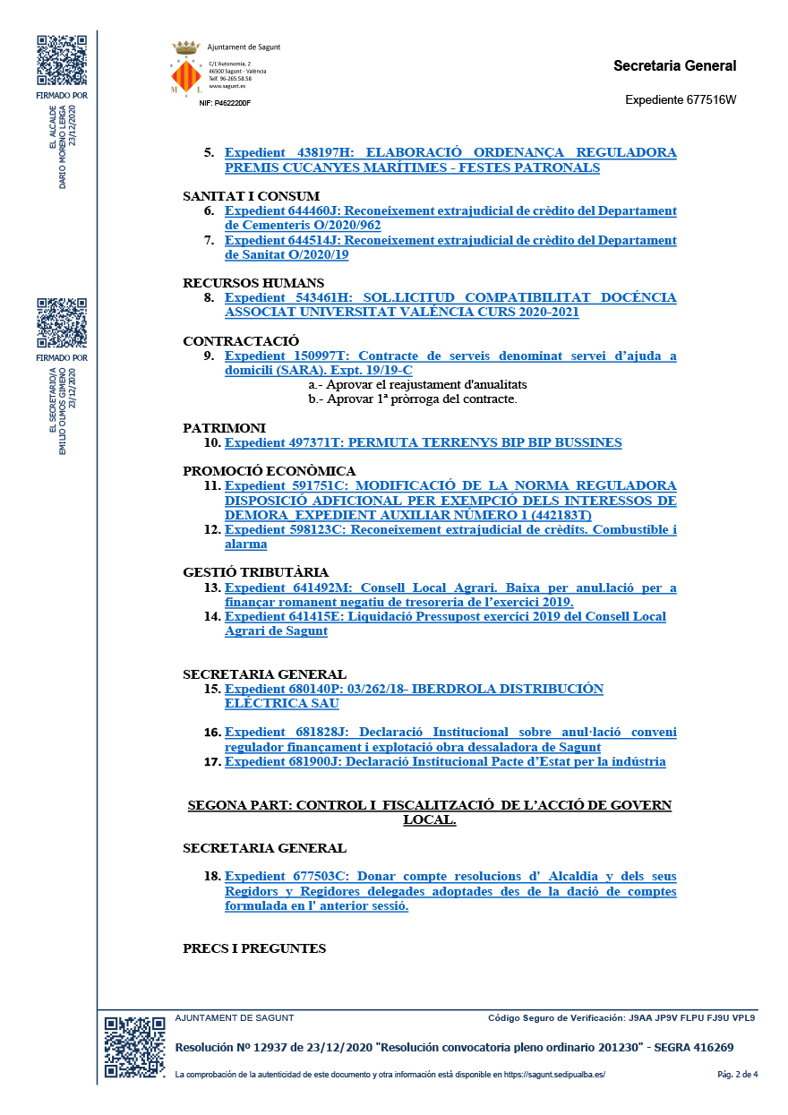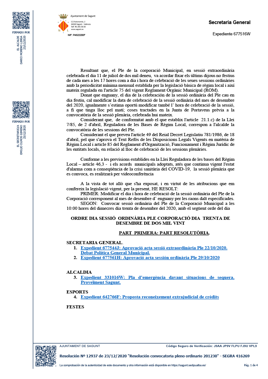 L'Ajuntament de Sagunt celebrarà el pròxim dimecres, 30 de desembre, el Ple Ordinari de la Corporació Municipal. Una vegada més, de forma telemàtica per complir amb les recomanacions de seguretat sanitàries a causa de la situació actual provocada per la pandèmia del coronavirus.