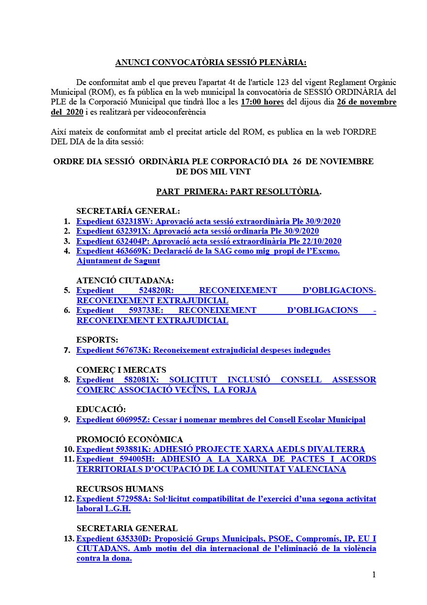 L'Ajuntament de Sagunt celebrarà dijous que ve, 26 de novembre, el Ple Ordinari de la Corporació Municipal. Una vegada més, de manera telemàtica per complir amb les recomanacions de seguretat sanitàries a causa de la situació actual provocada per la pandèmia del coronavirus.