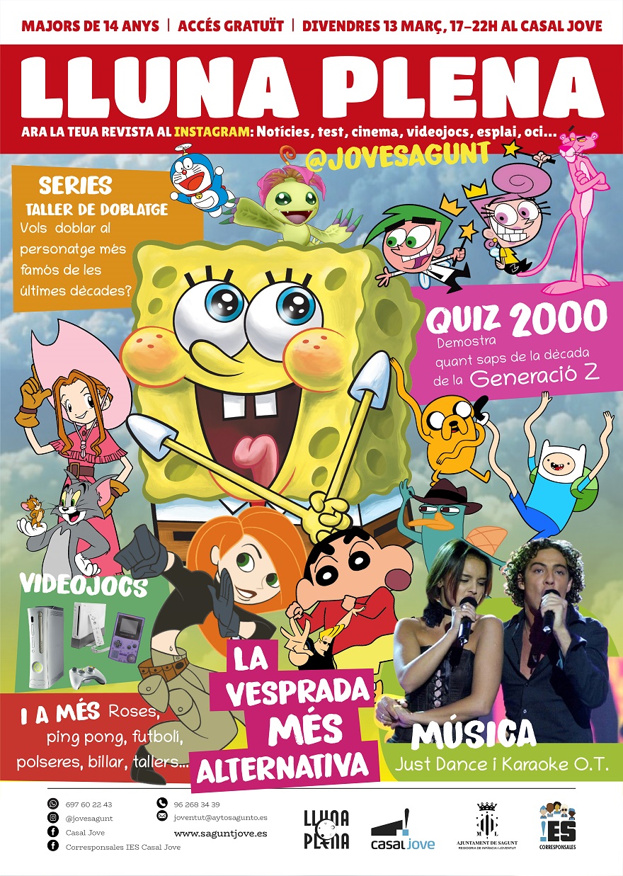 La Regidoria de Joventut i Infància, a través de l’equip de corresponsals dels IES del municipi, ha organitzat Lluna Plena que en esta ocasió va dedicat a la dècada dels 2000. El pròxim divendres 13 de març, de 17.00 a 22.00 hores, el Casal Jove del Port de Sagunt acollirà esta cita gratuïta per a majors de 14 anys sobre els anys en els quals els van veure nàixer.
