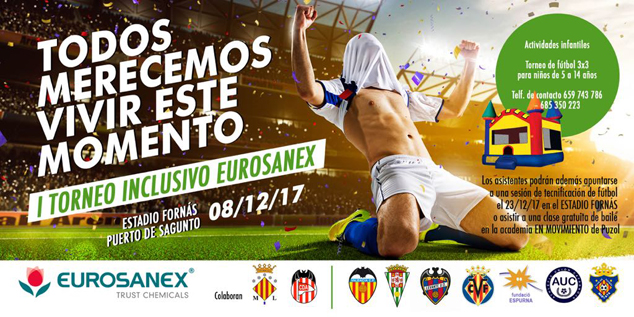 Divendres que ve, 8 de desembre, tindrà lloc en l'estadi Fornás del CD Acer, en el Port de Sagunt, el 1er Torneig Inclusiu de Eurosanex. L'esdeveniment està destinat a la integració en l'esport de persones amb diversitat funcional, amb la finalitat que gaudisquen de l'esport i passen una bona estona juntament amb jugadors de grans clubs. Per açò, esta activitat s'ocupa de crear una jornada de convivència entre els participants, de manera que es conega, establisquen llaços d'amistat i, sobretot, que ho passen ben practicant esport.