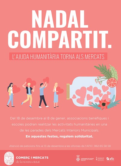 Finalment, la delegació de Comerç i Mercats ha dissenyat la campanya Nadal compartit que consistix a donar a conéixer i oferir la possibilitat d'ocupar, amb caràcter extraordinari, a col·lectius locals sense ànim de lucre i centres educatius locals els llocs vacants en qualsevol dels dos mercats interiors del municipi. La finalitat és dur a terme activitats solidàries i, en el cas dels centres escolars, a més, oferir a l'alumnat una experiència atractiva i real, formant part real del mateix mercat, durant un o diversos dies. La duració de la iniciativa serà des del 18 de desembre de 2024 al 8 de gener de 2025.