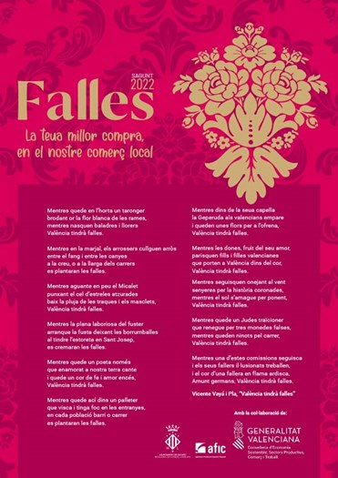 La regidoria de Comerç i Mercats de l'Ajuntament de Sagunt ha presentat este matí la campanya de comerç dissenyada exclusivament per a la festivitat de Falles 2022 davall el lema Falles, la millor compra en el nostre comerç local. Amb esta acció l'Ajuntament de Sagunt pretén fomentar i animar la ciutadania a realitzar les compres en els establiments del municipi, sempre guardant tota la prudència necessària en temps encara de pandèmia.
