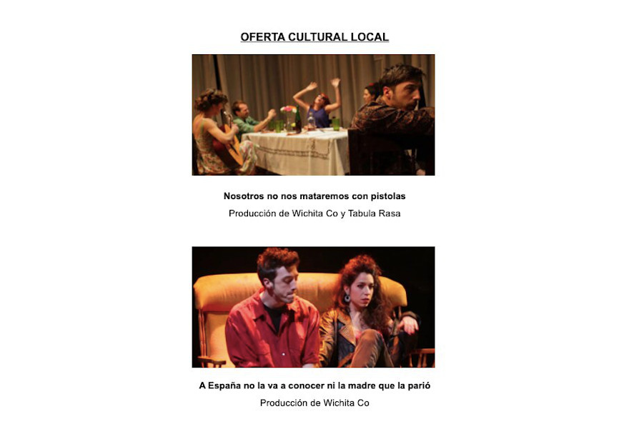 D'esta forma, la delegació porta la cultura fins als domicilis a través d'internet. En teatre, l'oferta cultural local és molt àmplia, obres com Nosotros no nos mataremos con pistolas, de Wichita Co y Tabula Rasa; A España no la va a conocer ni la madre que la parió, de Wichita Co y La Passió en viu, de l'associació Passió per Sagunt, són les obres teatrals que oferix Cultura durant estos dies. També, el departament ha inclòs un enllaç amb la teatroteca del Ministeri de Cultura, on les persones interessades tenen disponibles més de 1.500 obres de teatre, circ i dansa.