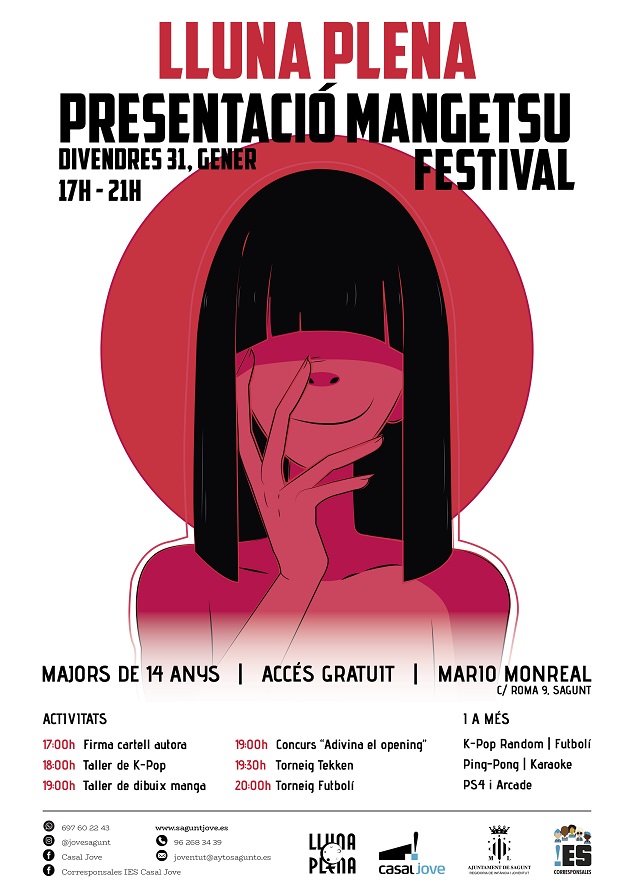 La presentació començarà a les 17 hores amb l'assistència de l'autora del cartell del Festival Mangetsu, Estrella Fuzhen, que estarà signant cartells per a qui desitge tindre un record del festival. A partir de les 18 hores començaran els tallers. En primer lloc es realitzarà el de K-Pop, una modalitat de ball coreà. Seguidament, a les 19 hores, tindrà lloc el taller de dibuix manga, un dels més sol·licitats durant els dies en què se celebra el festival, i el concurs ‘Endevina el opening’, sobre les principals sèries manga i anime.