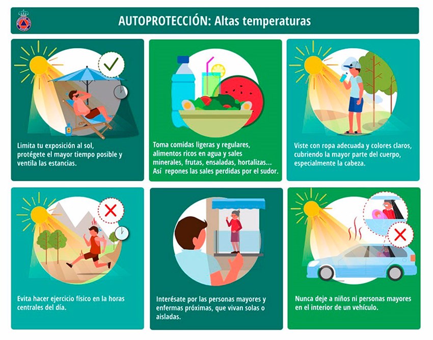 És recomanable vestir amb roba adequada i colors clars, cobrint la major part del cos, especialment el cap. A més, cal evitar fer exercici físic en les hores centrals del dia. Respecte a l'entorn social, cal interessar-se per les persones majors i malaltes pròximes, que visquen soles o aïllades i mai cal deixar els xiquets i xiquetes ni persones majors a l'interior d'un vehicle.