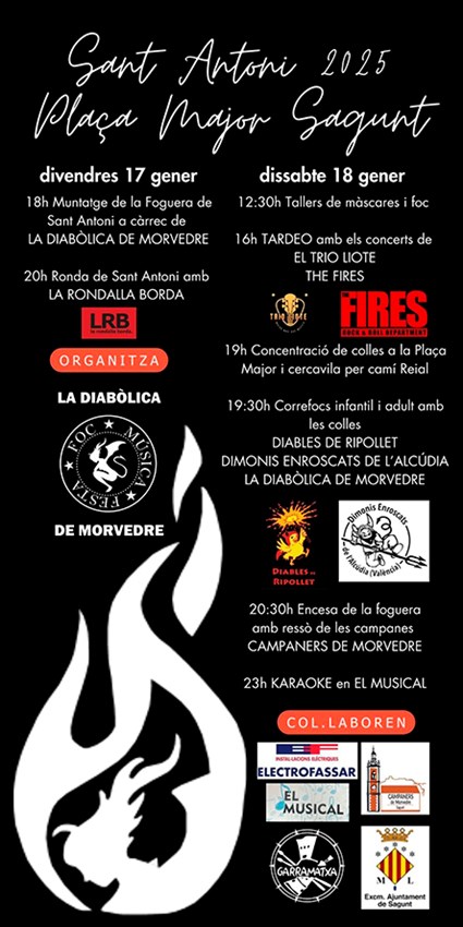 El divendres, 17 de gener, a partir de les 18 hores, La Diabòlica de Morvedre prepararà una foguera per Sant Antoni. I a les 20 hores tindrà lloc una ronda de Sant Antoni interpretada per la formació musical La Rondalla Borda.