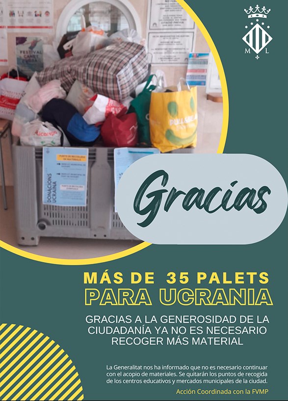 La Generalitat Valenciana ha enviat un comunicat en el qual informa sobre el cessament de recollida de material per a Ucraïna, per este motiu hui acaba el període de deixar material en els col·legis i se sol·licita que ja no es porte més material als punts habilitats en els mercats municipals.