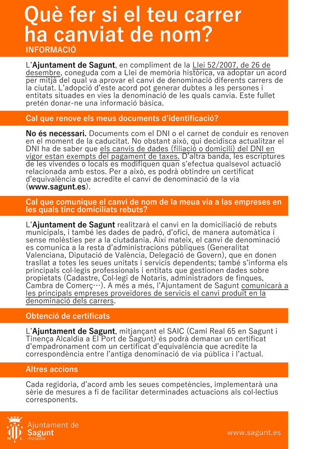 Entenent que el canvi de nom de les vies públiques és una actuació que afecta de forma directa el veïnat i les empreses, per part de l'Ajuntament de Sagunt s'ha previst prendre les mesures per a afavorir i facilitar el procés d'actualització de dades de la ciutadania afectada pel compliment de la Llei i d'esta forma minimitzar les molèsties que puguen generar-se. L'adopció d’este acord pot generar dubtes a les persones i entitats situades en vies la denominació de les quals canvia. No és necessari renovar documents com el DNI o el permís de conduir, no obstant açò, qui decidisca actualitzar el DNI ha de saber que els canvis de dades (filiació o domicili) del DNI en vigor estan exempts del pagament de taxes. D'altra banda, les escriptures dels habitatges o locals es modifiquen quan s'efectua qualsevol actuació relacionada amb estos. Per açò, es podrà obtindre un certificat d'equivalència que acredite el canvi de denominació de la via (www.aytosagunto.es).